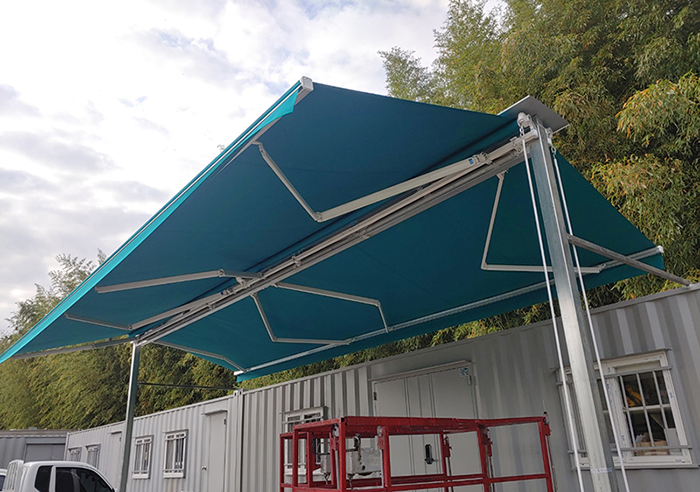 접이식 구동어닝을 서로 교차하여 차양공간을 한층더 넓게 활용할 수 있는 유럽풍 차양 시스템 입니다.